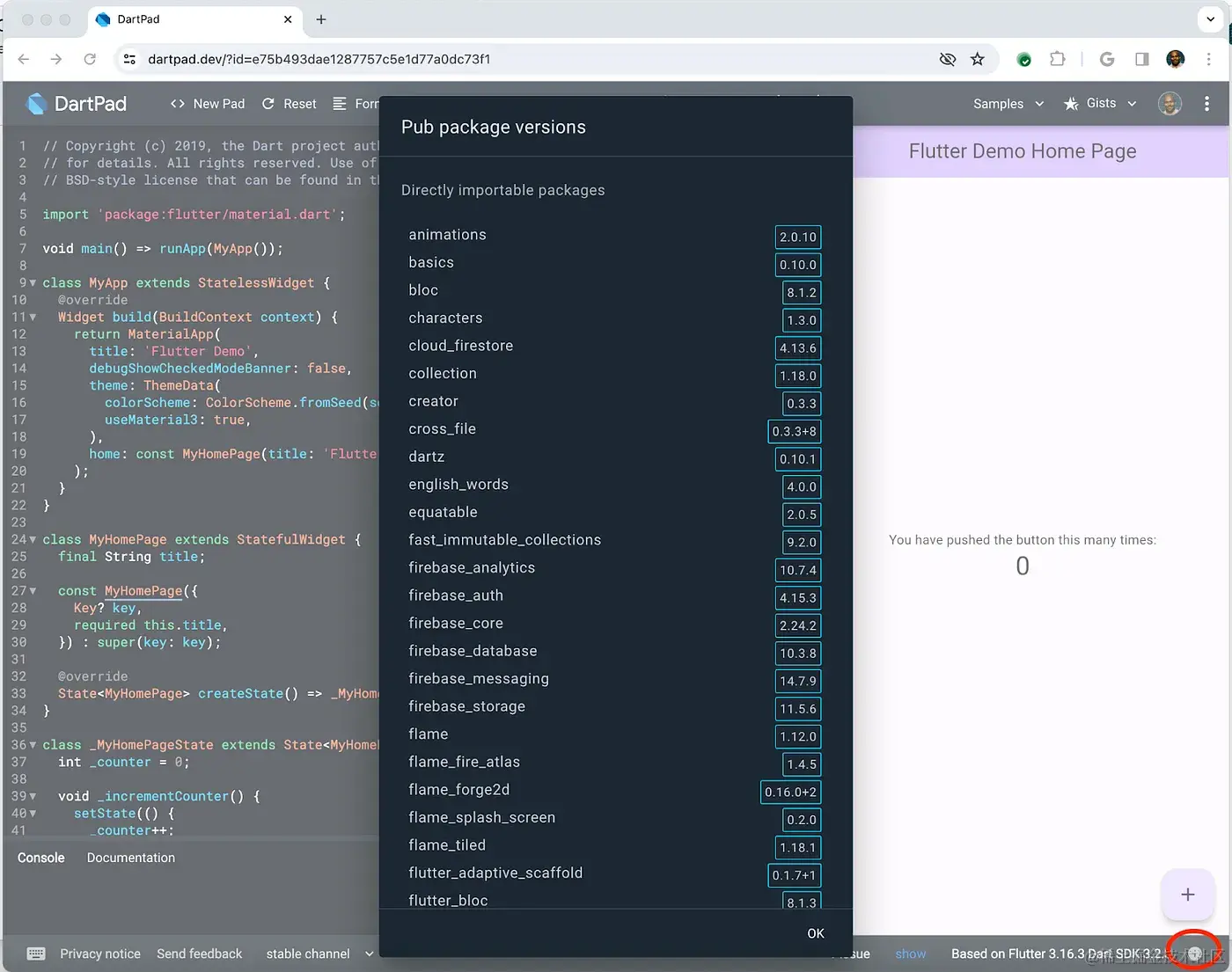 DartPad 支持一组固定的软件包,您可以通过单击屏幕右下角的信息图标来查看这些软件包。 Google 的 Flutter 和 Dart 团队持续审查包请求并确定其优先级。如果您希望将某个包添加到 DartPad,请将您的大拇指添加到现有的包建议(如果有),或者根据您的建议打开一个新 issue。