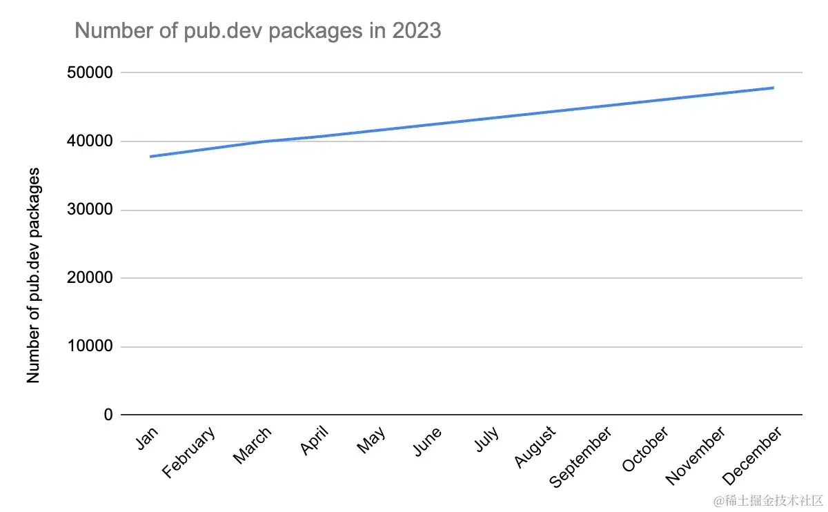 Flutter 和 Dart 包生态系统仍然是开发人员从单一代码库为任何屏幕构建漂亮、高性能应用程序的关键驱动因素。2023年,该生态系统从1月份的3.8万个包增长到12月底的4.8万个包,增长了26%。