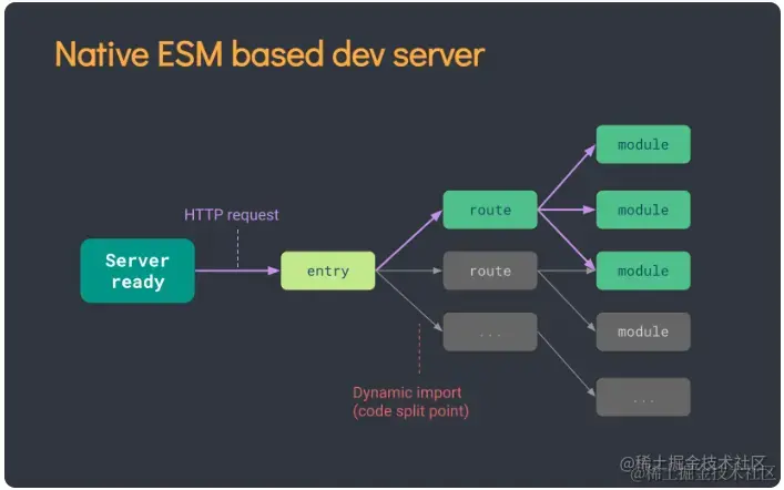 利用浏览器原生的ES Module编译能力,省略费时的编译环节,直给浏览器开发环境源码,dev server只提供轻量服务。