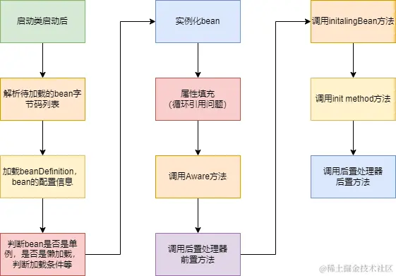 看以上代码我们不难分析出通过bean配置信息加载bean的过程中,一个bean需要经过6步周期性工作才会被放入容器中给我们使用。以下是图示: