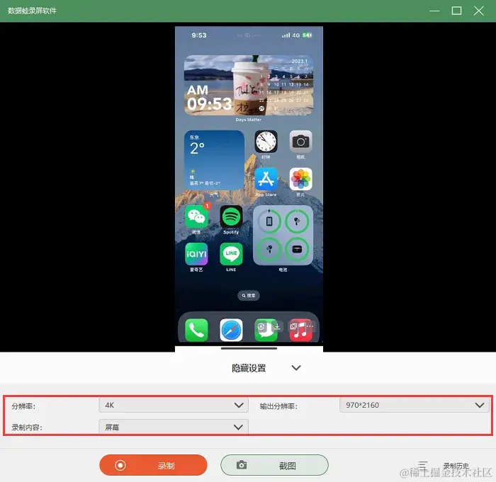 第3步:投屏成功后,你可以在录制页面进行设置,对分辨率、输出分辨率以及录制内容进行调整,还可以选择录制扬声器与麦克风。