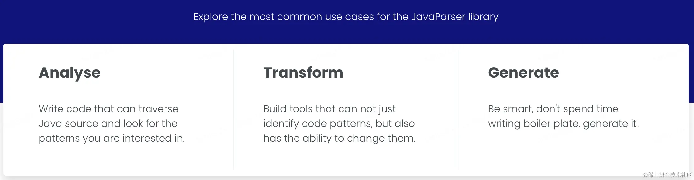 JavaParser 是一个开源的 Java 源代码分析工具,它提供了一系列简单的API来解析、修改和生成 Java 代码。