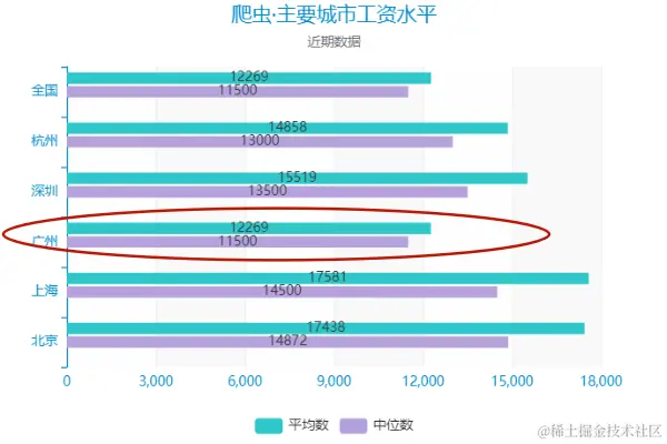 可以看到,目前广州的爬虫工程师们,平均收入为12269元,收入中位数是11500元,