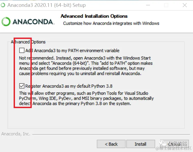 Advanced Options 不勾选 Add Anaconda3 as the system PATH environment variable;