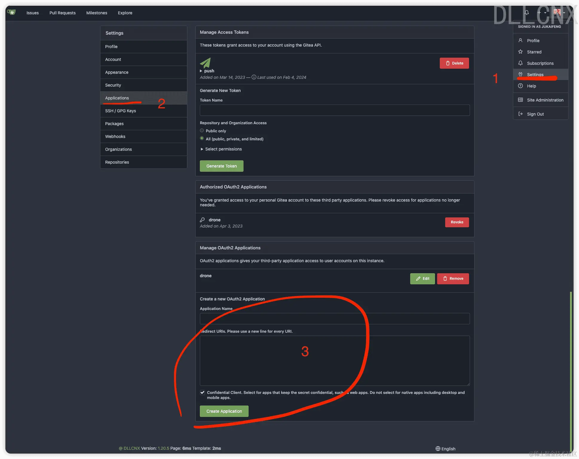创建 Gitea OAuth 应用程序。Client ID 和 Client Secret 用于授权访问 Gitea 资源。setting->Applications->create Applications。