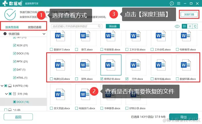步骤3:在第一次扫描结束后,用户可以先对扫描到的文件进行查看,查看时,可以根据文件类型,也可以根据文件的保存路径。只找到部分文件的情况下,点击 【深度扫描】会获取更多数据;