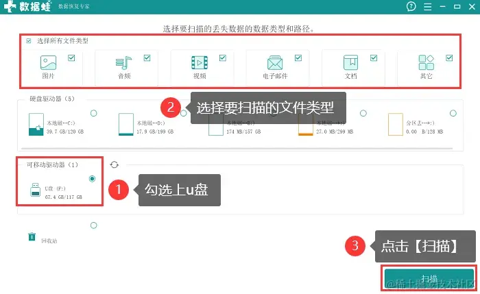 它不仅支持多种类型数据的恢复,也支持多种存储设备的扫描。同时软件还支持免费试用。如果u盘的文件丢失了,建议用户先借助软件对数据进行扫描。软件的操作如下。