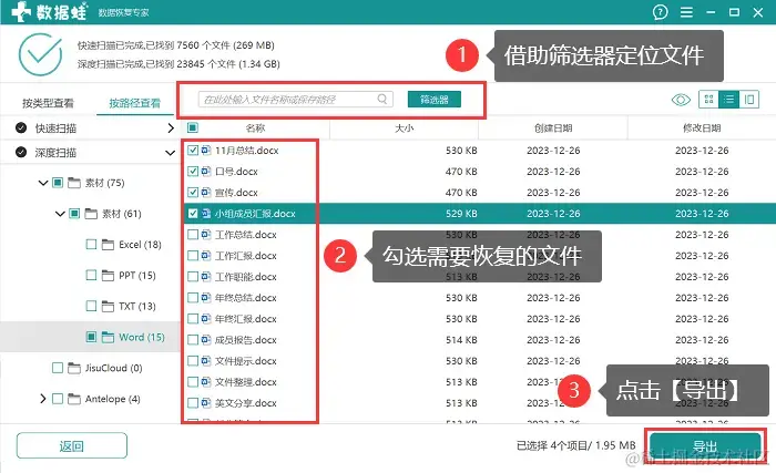 步骤4:在深度扫描结束后,用户可以再一次对扫描到的文件进行查看和选择。在查看时,如果文件太多,借助 【筛选器】 ,有利于快速定位到文件,将所有文件选择齐全后,点击 【导出】 ,并选择电脑上的任意一个磁盘来保存文件。