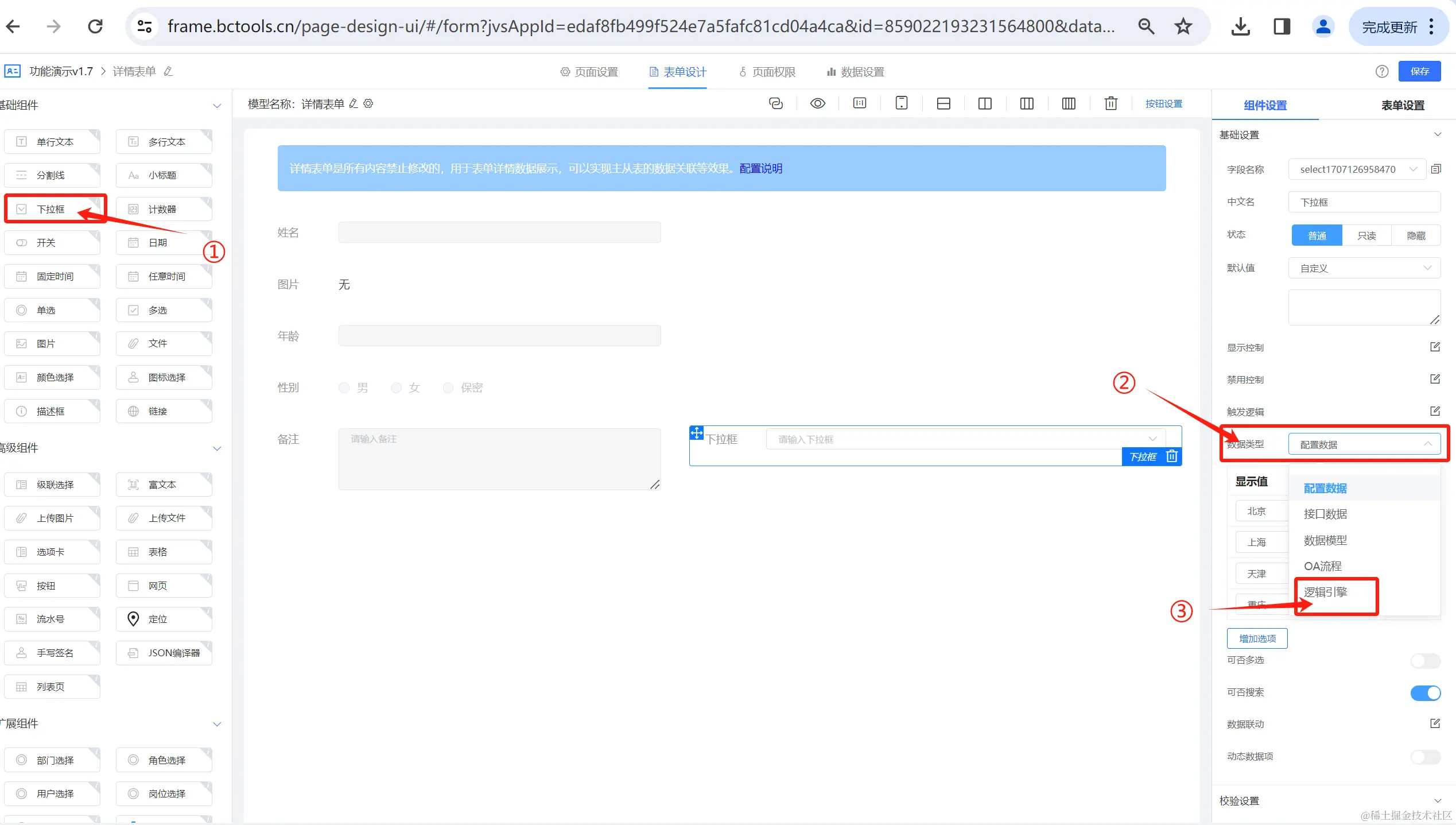 2、下拉组件数据支持逻辑引擎获取;