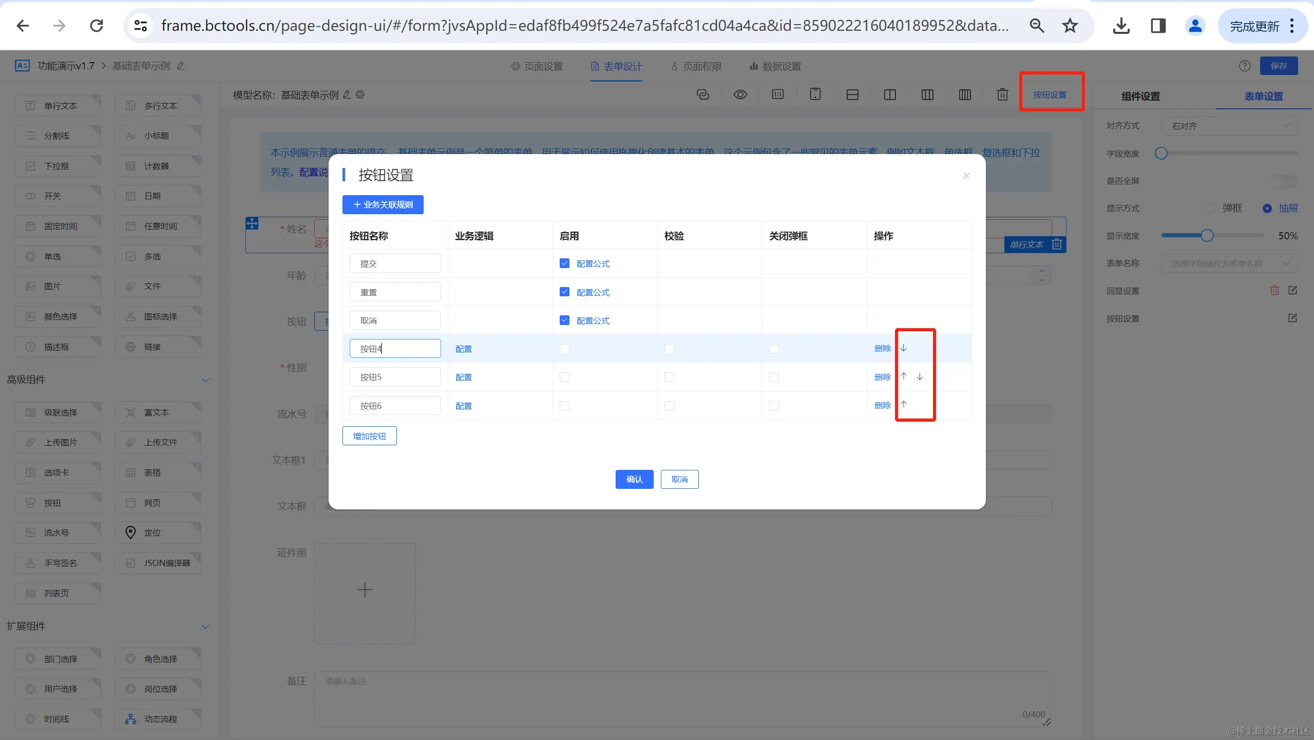 3、表单自定义按钮支持排序功能;
