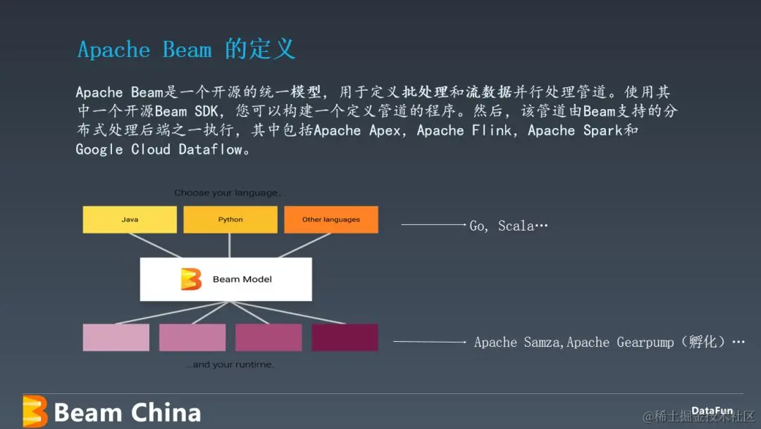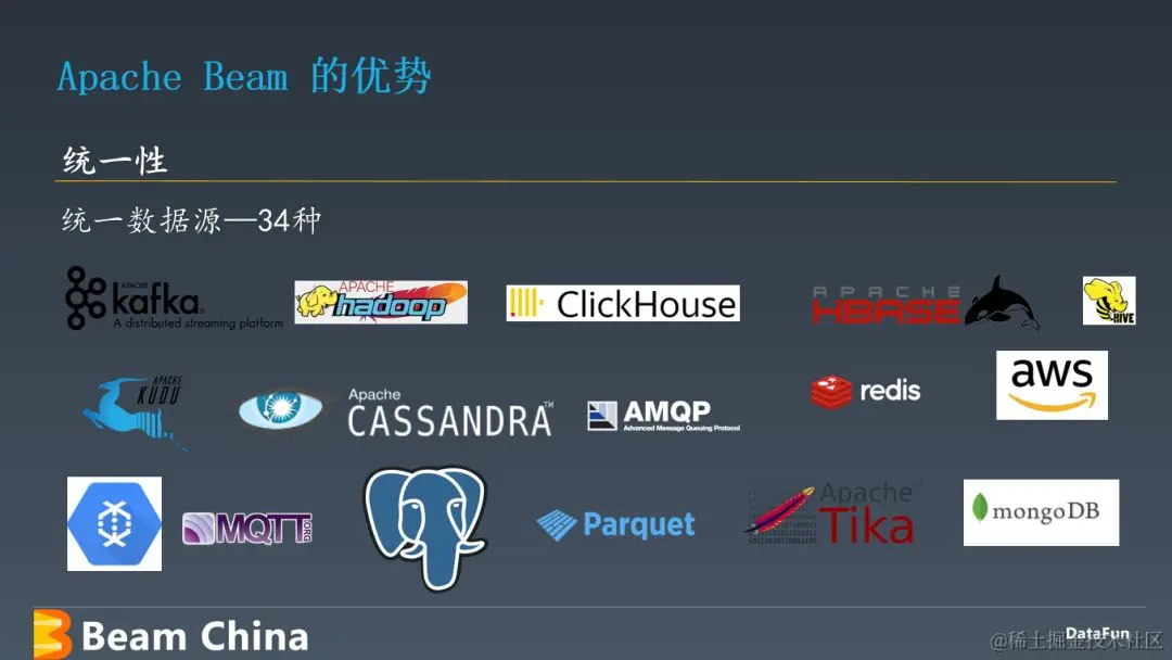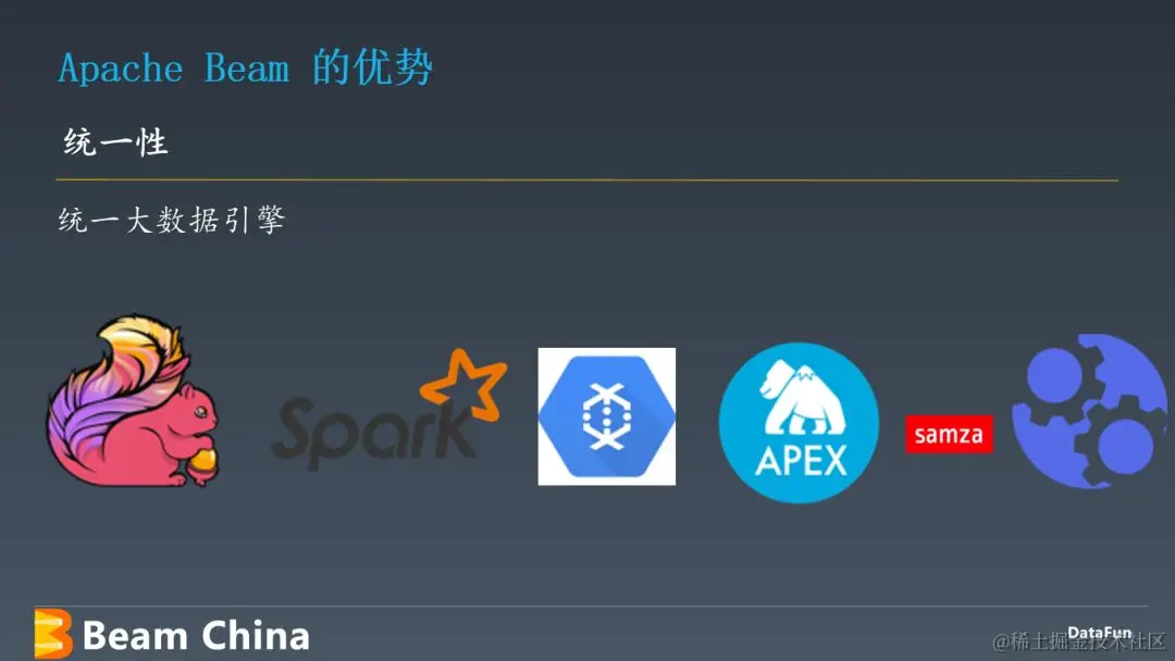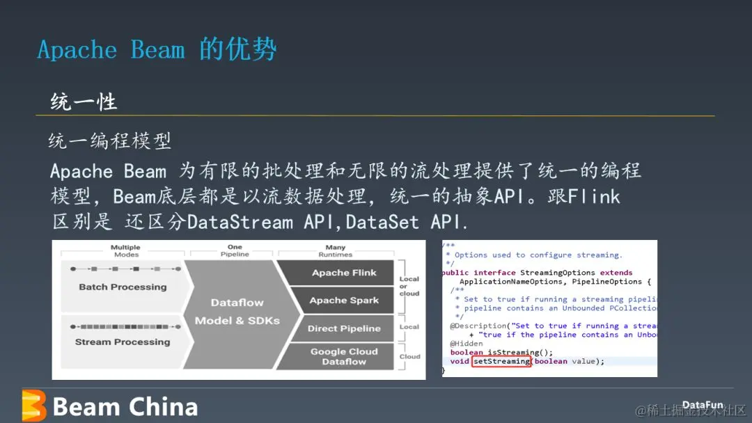 ② 统一编程模型,Beam 统一了流和批,抽象出统一的 API 接口。