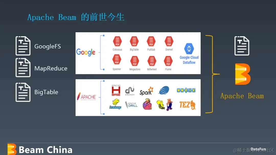 大数据起源于 Google 2003年发布的三篇论文 GoogleFS、MapReduce、BigTable 史称三驾马车,可惜 Google 在发布论文后并没有公布其源码,但是 Apache 开源社区蓬勃发展,先后出现了 Hadoop,Spark,Apache Flink 等产品,而 Google 内部则使用着闭源的 BigTable、Spanner、Millwheel。这次 Google 没有发一篇论文后便销声匿迹,2016年2月 Google 宣布 Google DataFlow 贡献给 Apache 基金会孵化,成为 Apache 的一个顶级开源项目。然后就出现了 Apache Beam,这次不它不是发论文发出来的,而是谷歌开源出来的。2017年5月17日 发布了第一个稳定版本2.0。