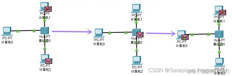 首先,数据包由主机0发送到集线器,接着,集线器将其广播发送给主机1和主机2,最后,主机1收到报文后检查报文的目的MAC地址,与主机1网卡不同因此拒绝接收,同理主机2收到检查发现与报文MAC地址匹配故接收成功,并且主机2给发送方返回发送响应: