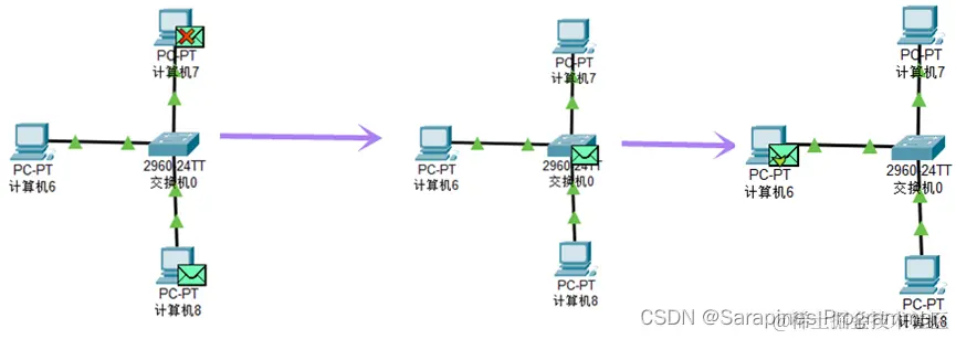 (5)step5 主机通过交换机进行数据传输: 通过主机6与主机8间发送数据包实现,在左上角工具栏鼠标点击信封(添加简单的PDU),交换机的数据传输: