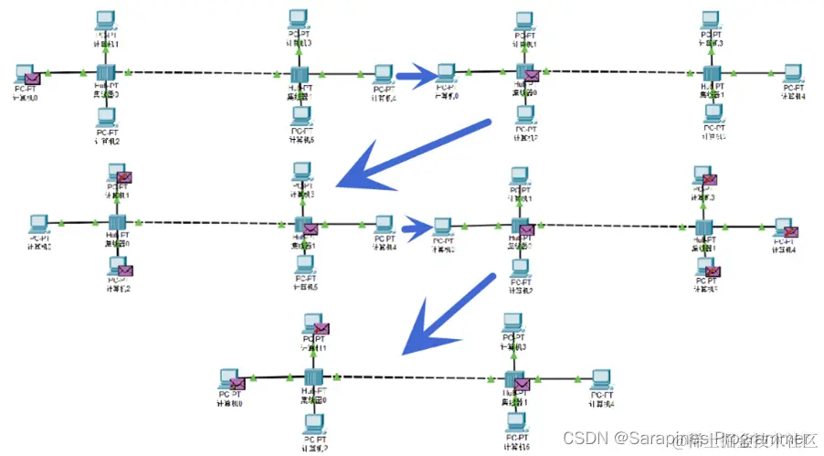 - 在集线器网络中,所有设备共享带宽,存在冲突和碰撞,导致性能下降。