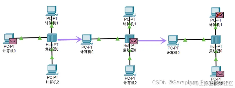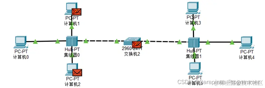 (4)step4 主机通过集线器进行数据传输: 通过主机0与主机2间发送数据包实现,在左上角工具栏鼠标点击信封(添加简单的PDU),集线器的数据传输;
