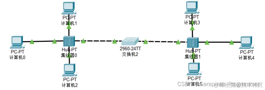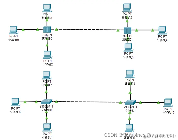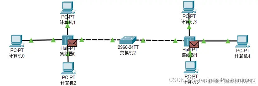 (6)step6 互联局域网: 通过选择自动连线互联两个通过集线器互联的局域网,在扩大通信范围同时扩大碰撞率,同理连接两个交换机互联的局域网,遇到互联线不显示绿色可通过多次切换实时模式和仿真模式进行解决,最终效果: