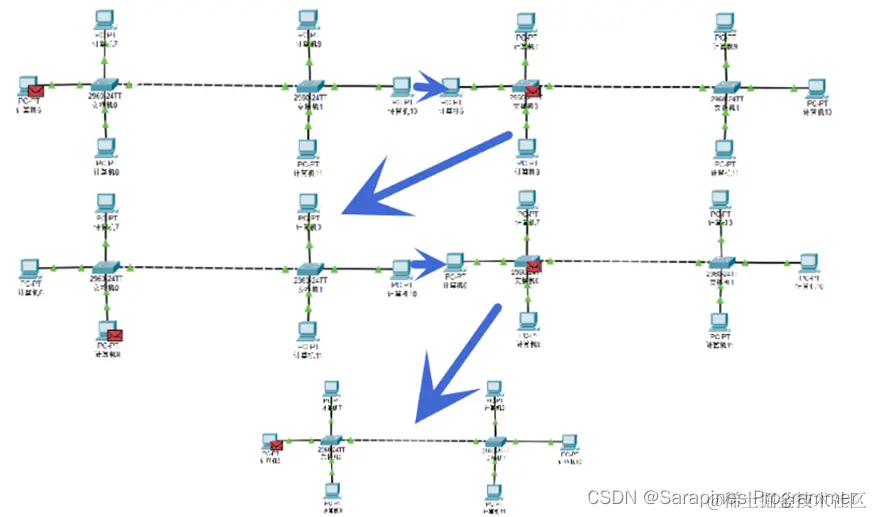 我们发现一个在集线器组成的局域网中数据包的传输会经过每一个主机,而交换机组成的局域网中数据包传输类似定向传输。