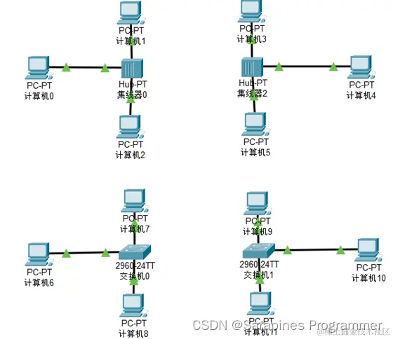 (1)step1 构建四个以太网: 在逻辑工作空间选择12台终端设备(此处拖动的为主机)、12条连接线(此处拖动的为自动选择连接线类型)以及两台交换机和两台集线器,构造网络拓扑: