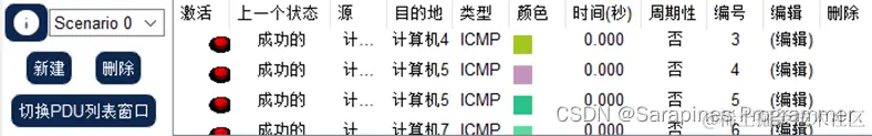 (3)step3 各主机间发送数据包: 为了防止ARP广播请求对本次实验效果产生影响,实验切换到实时模式下让各主机间发送数据包,查看端口状态汇总表: