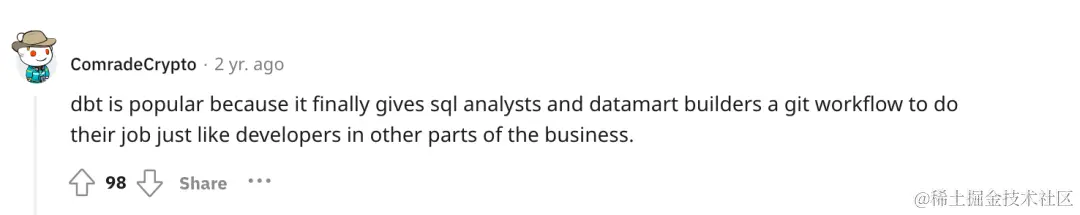 “dbt 这么流行是因为它为 SQL 分析师和数据集市构建者提供了 Git 工作流,使得他们可以跟其他软件工程师一样工作。”