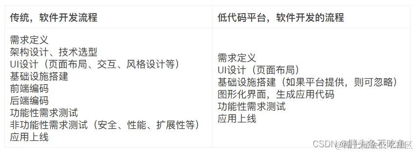 对比可以发现,低代码平台对比传统开发方式,在以下开发环节做了优化: