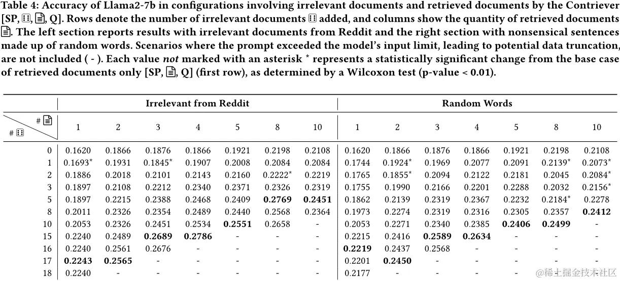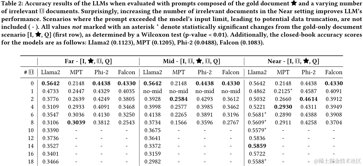 首先,作者研究了在添加相关但不包含答案的文档时,RAG系统的准确率会显著下降。这表明区分相关和非相关信息是RAG系统的一个挑战。然后,作者通过将黄金文档放置在不同位置来研究其对模型性能的影响。结果表明,在查询旁边放置黄金文档可以提高准确率,而将其放在中间或远处则会降低准确率。此外,作者还研究了随机无关文档的引入对RAG系统性能的影响。结果表明,无论是在更接近查询的位置还是在更远的位置添加无关文档,都会提高准确率。