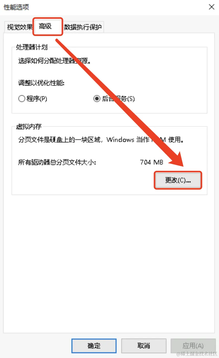 5、在性能选项窗口中,切换到"高级"选项卡,并在"虚拟内存"部分点击"更改"按钮。