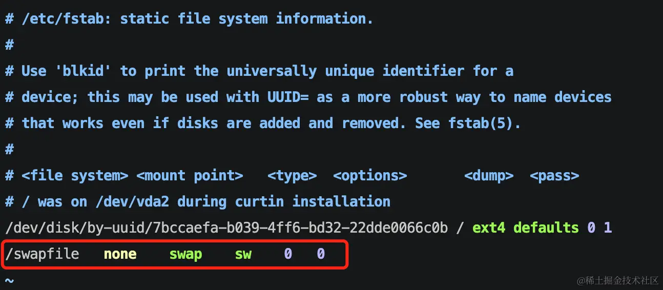 第六步:设置永久使用swap文件(系统在启动时自动启用swap文件)