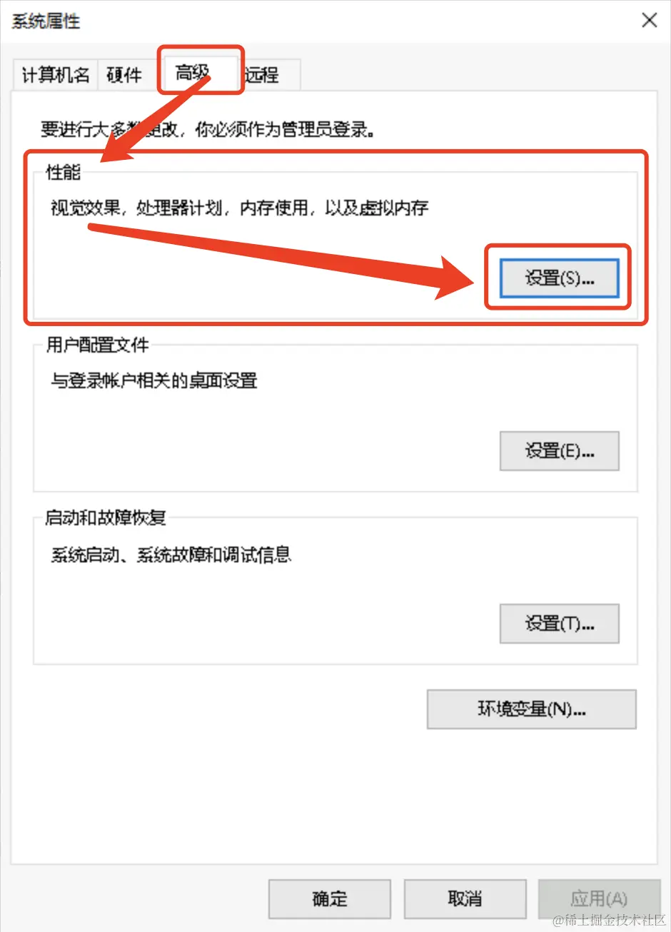 性能选项弹窗:先应用,再确定! 系统属性弹窗:确定。