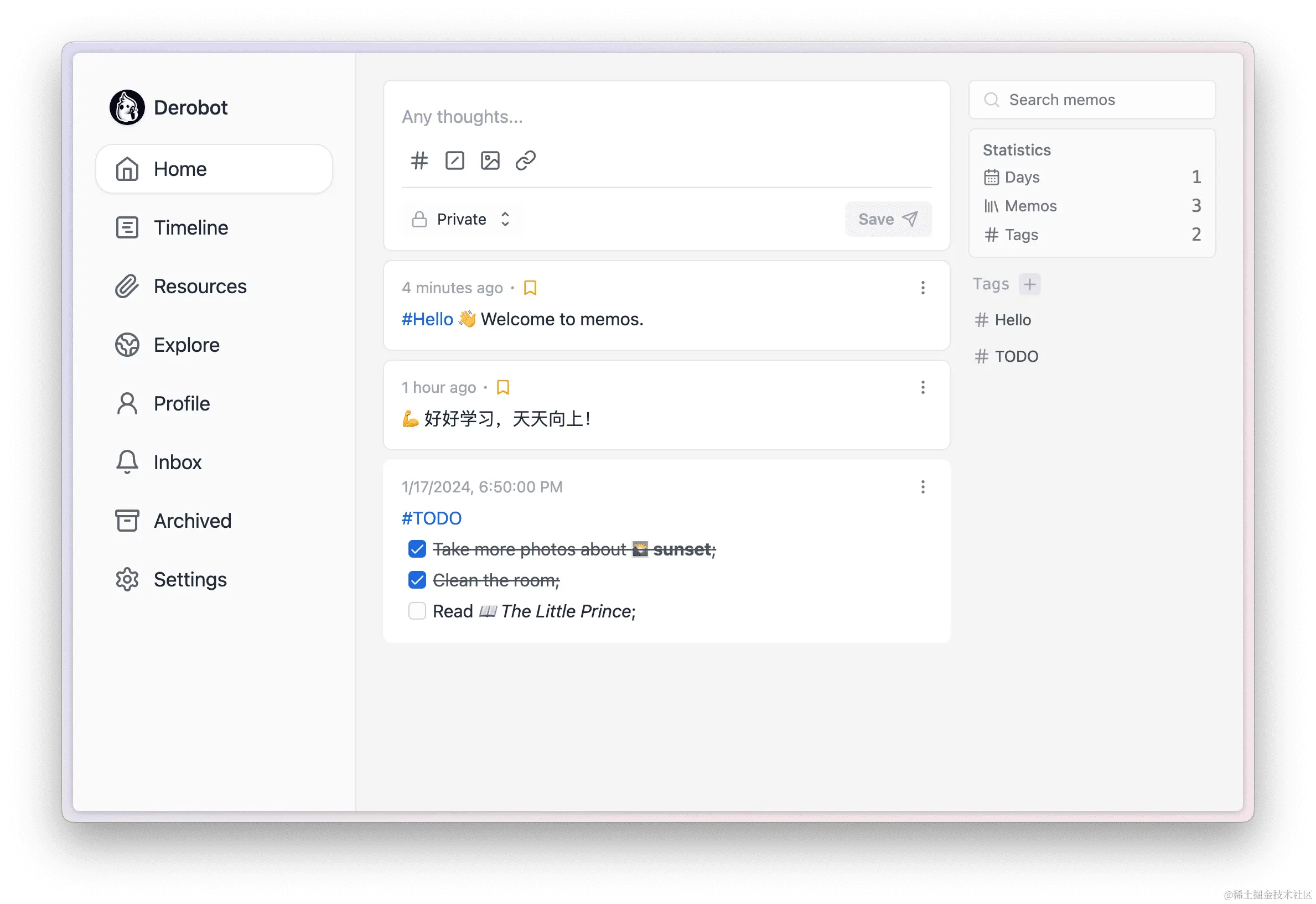 这是一个采用 React+Tailwind+TypeScript+Go 开发的备忘录中心,相当于极简的微博。支持私有/公开备忘录、标签、互动式日历等功能,以及 Docker 部署。