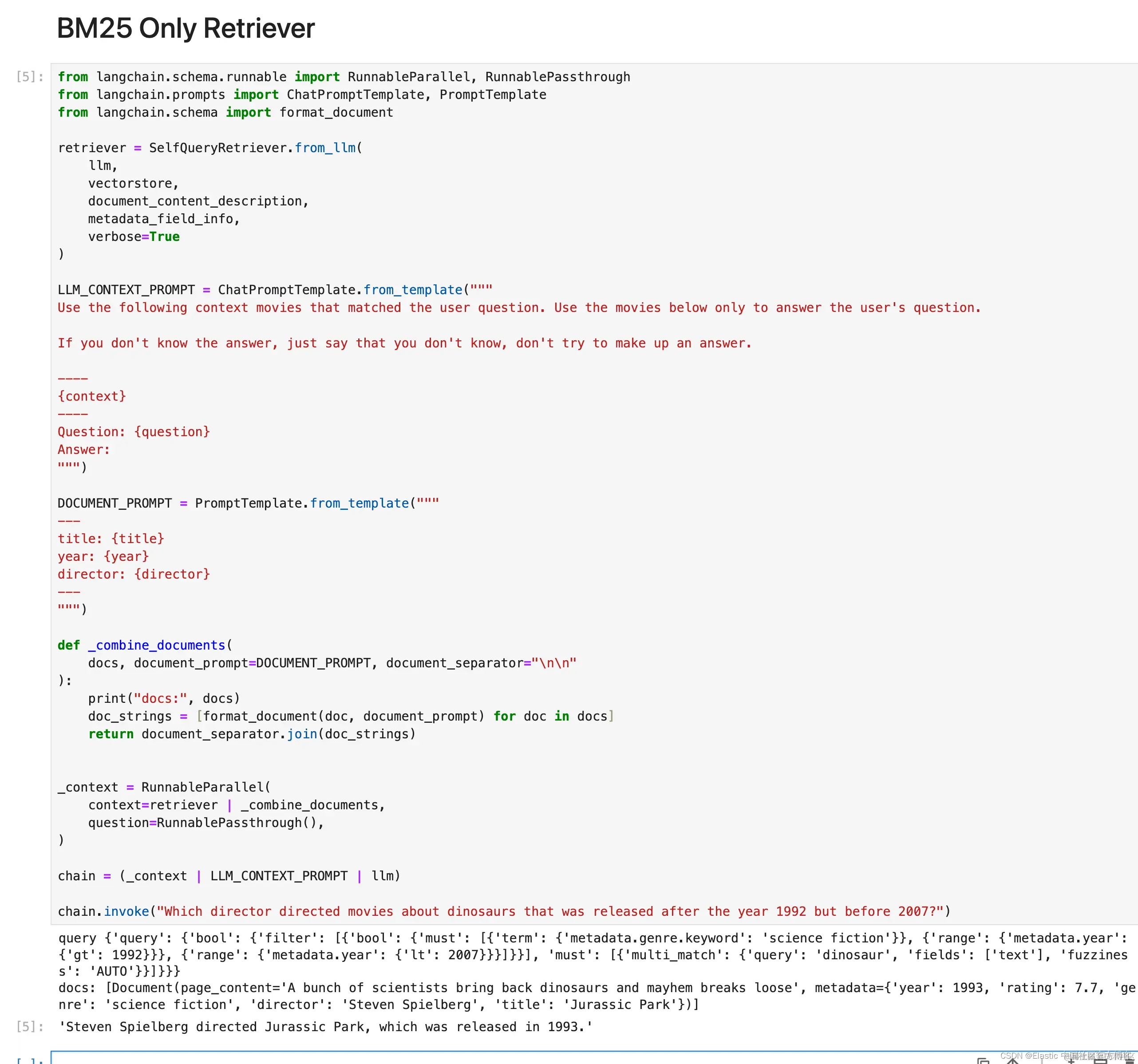 本工作簿演示了 Elasticsearch 的自查询检索器将非结构化查询转换为结构化查询的示例,我们将其用于 BM25 示例。