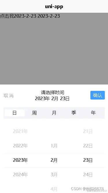time用于控制显示的默认日期;type=“日” time="2024-1-23" 代表默认显示日、time代表选中日期2024年1月23日