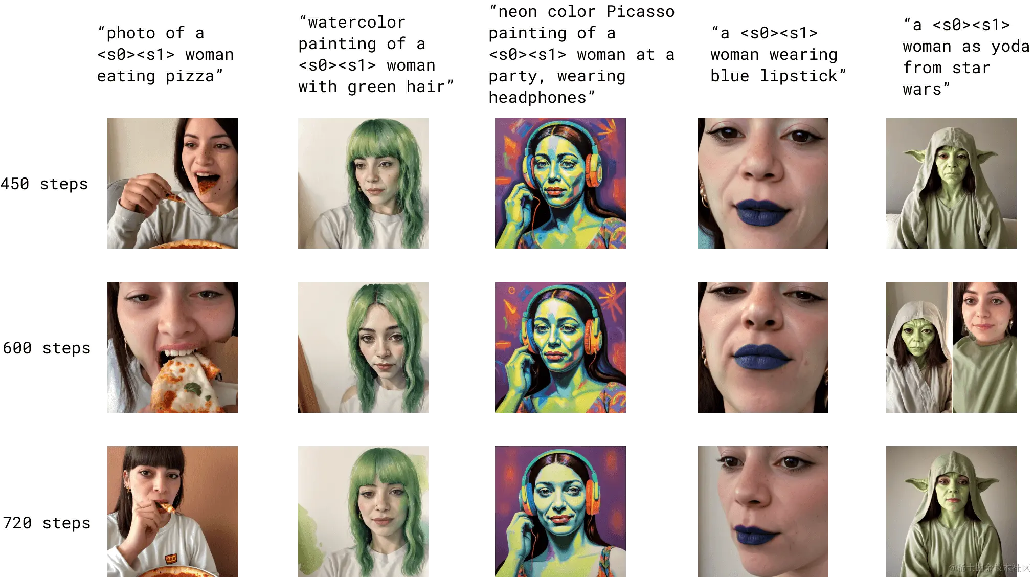 当使用真实图像数据集时,我们注意到语言漂移更少 (即模型不会将“女人/男人”一词仅与经过训练的面孔相关联,而是可以生成不同的人) ; 同时在输入含经训练的人脸相关词元的提示词情况下,其生成又能保证真实感及整体质量。