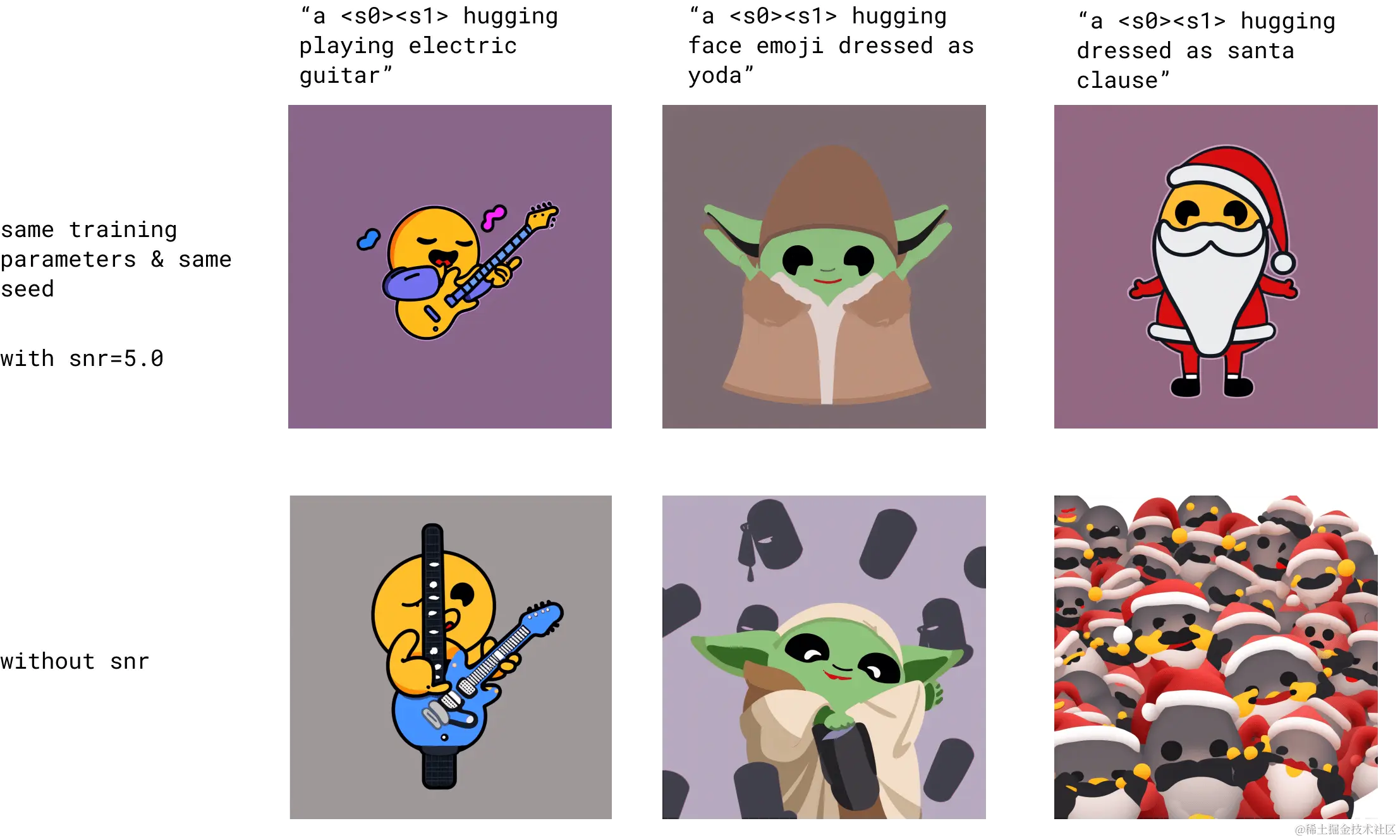 枢轴微调 技术巧妙地将 文本逆化 与常规的扩散模型微调相结合。以 Dreambooth 为例,进行常规 Dreambooth 微调时,你需要选择一个稀有词元作为触发词,例如“一只 sks 狗” 中的 sks 。但是,因为这些词元原本就来自于词表,所以它们通常有自己的原义,这就有可能会影响你的结果。举个例子,社区之前经常使用 sks 作为触发词,但实际上其原义是一个武器品牌。