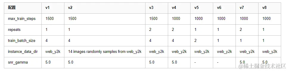 对于 v1,我们选择了训练 Huggy LoRA 时的最佳配置作为起点 - 显然过拟合了。因此我们尝试在下一个版本中通过调整 --max_train_steps 、 --repeats 、 --train_batch_size 以及 --snr_gamma 来解决这个问题。更具体地说,我们基于这四个配置迭代了 8 个版本,如下 (所有其余配置保持不变):