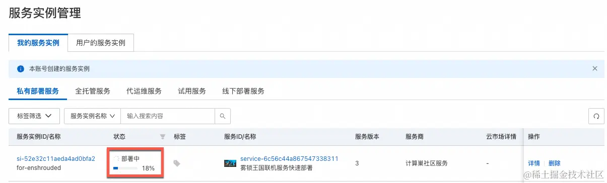 - 当出现提交成功提示,说明服务已经开始创建,点击“去列表查看”,可以看到服务正在部署中。