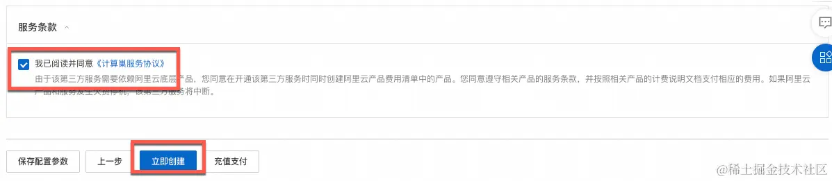 - 在服务确认页面,勾选同意服务条款,点击“立即创建”,后面就是付款流程。