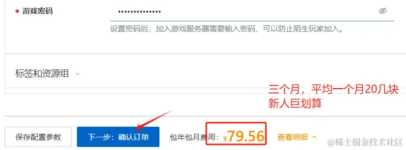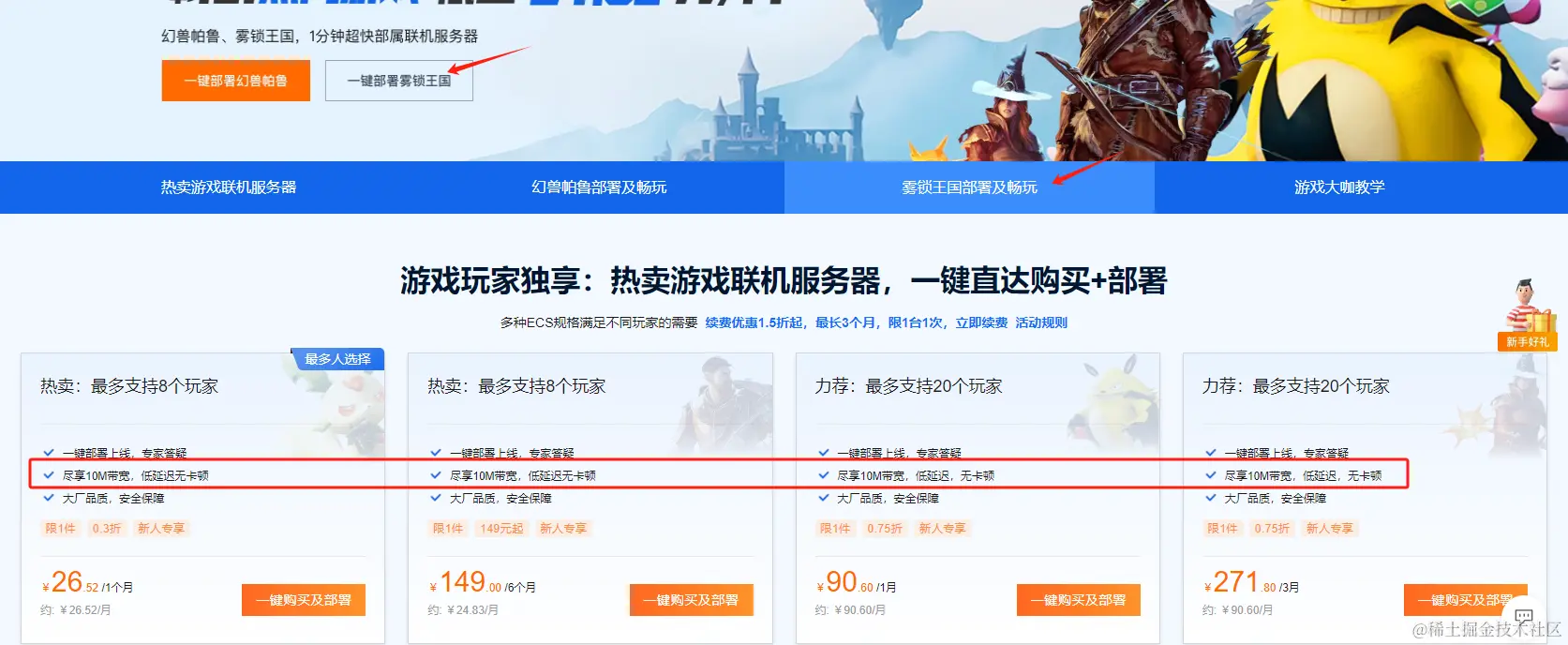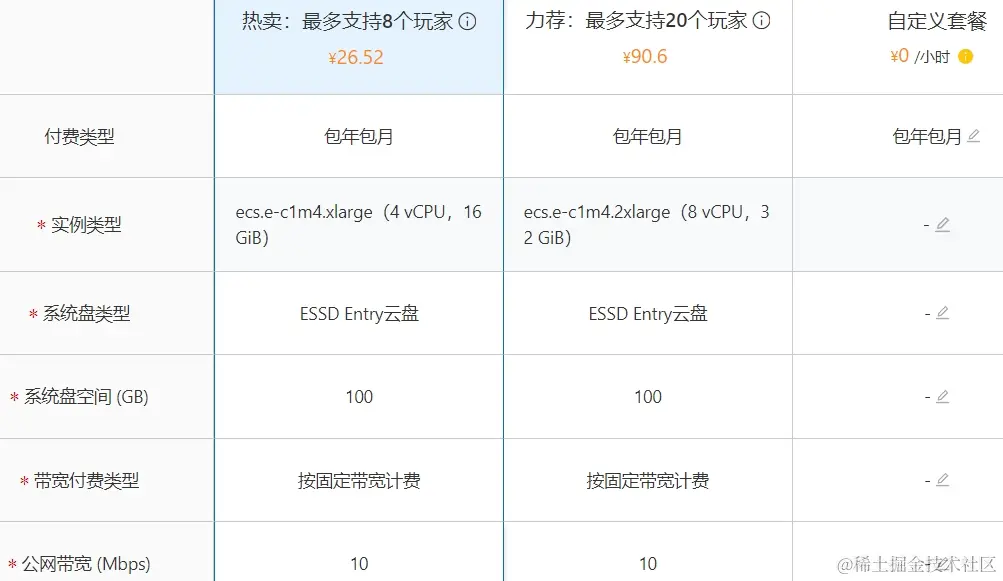 - 选择配置,一般来说配置越高越流畅。这游戏比较吃内存,官方的推荐配置是4核16G,带宽方面推荐不限流量的固定带宽,延时低,畅玩体验更佳,这里的10M带宽完全够用。