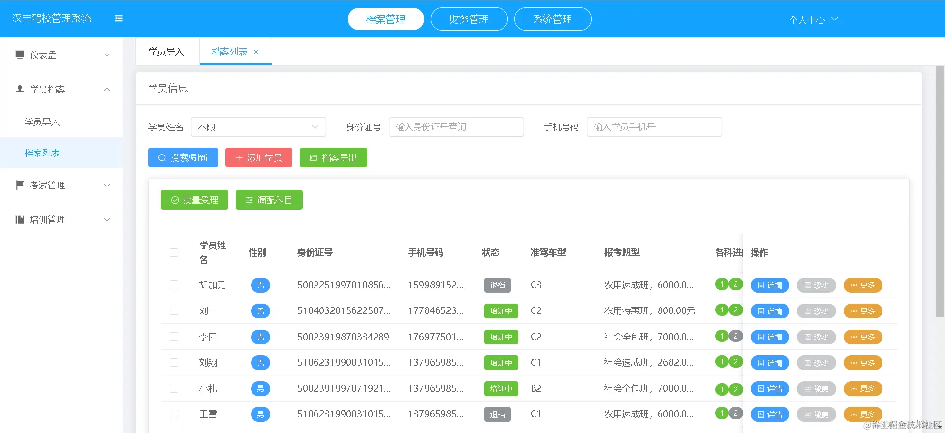 学员档案信息、学员考试信息、教练分配信息以及练车记录