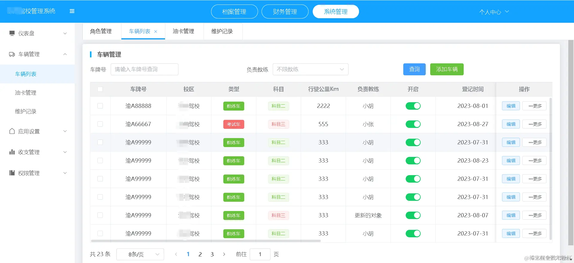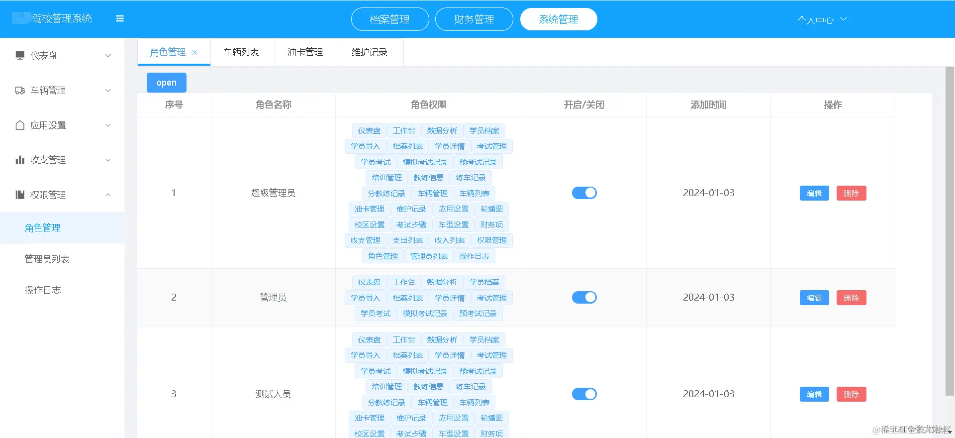 系统管理分为:系统设置以及系统权限设置,可以配置驾校的一些车辆的管理信息、准考车型设置、财务项的设置,以及系统权限、角色权限分配的一些设置。