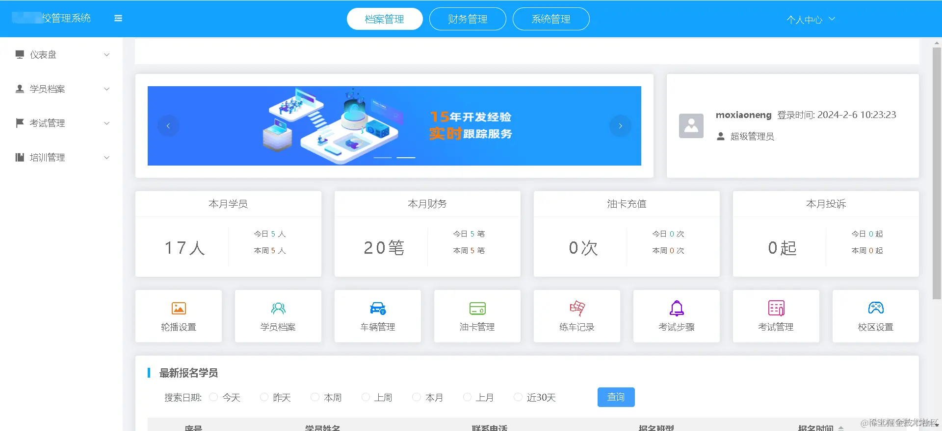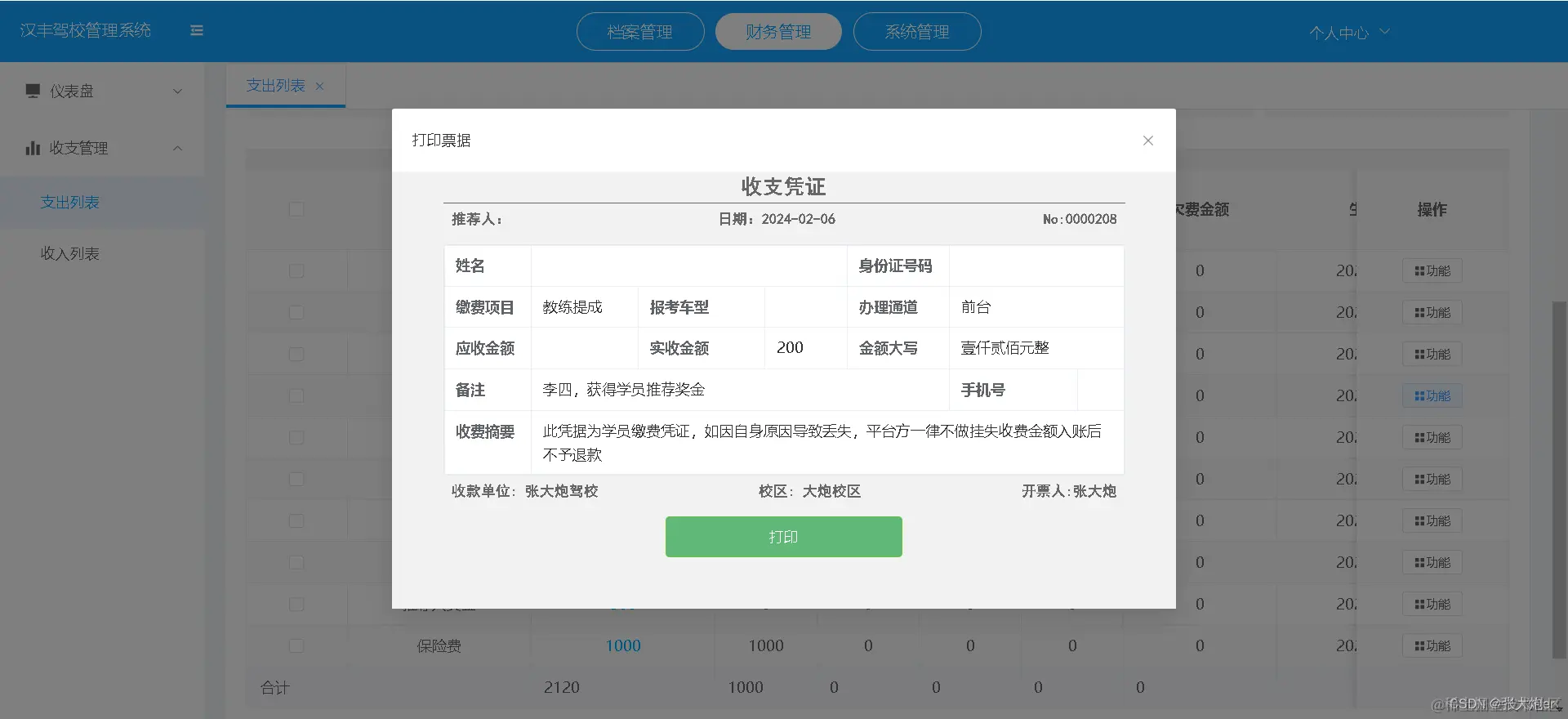 财务收支以及财务收入管理、财务收支可以实现给学员以及教练提供收支单据的提前预览以及报销单的打印功能