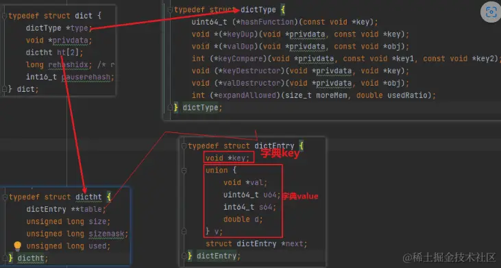 dict中dictht是一个数组,一共有两个元素,目的就是为了rehash的时候使用