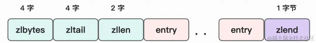 zlbytes存放了int值,占 4 字节,表示整个ziplist占的总字节数zltail存放了int值,占 4 字节,记录了最后一个entry在ziplist里面的偏移字节数,这样主要是为了方便 逆序遍历- 当知道