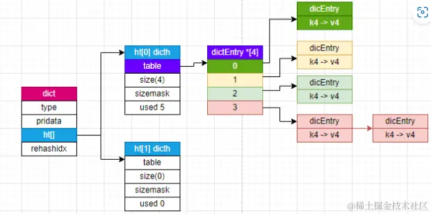 dict结构,如下图所示 rehashidx为 0 时表示进行rehash,为 -1 时表示rehash已经完成
