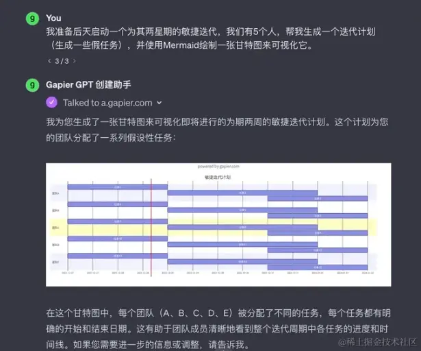 8、Gapier 项目助理:这最近我在开发一个项目(Gapier: 给 ChatGPT的 GPTs 增加50种额外能力),因为我后来发现,真正独特的GPTS应用,来自对Action的使用。我前面提到的很多Aciton都来自这个项目。项目助理基本上帮我管理了这个项目的进度设计、文档完善、文案设计、推广策略等等,最近还能帮我画一些图形,比如甘特图: