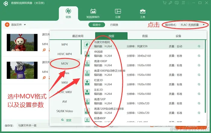 步骤3:也可以在调整视频参数、设置之后,再选择视频输出格式。点击 【输出格式】 按钮,在 【视频】 窗口,选中 【MOV】 格式。对于编码器、分辨率、质量等参数,可以在窗口右侧进行选择。