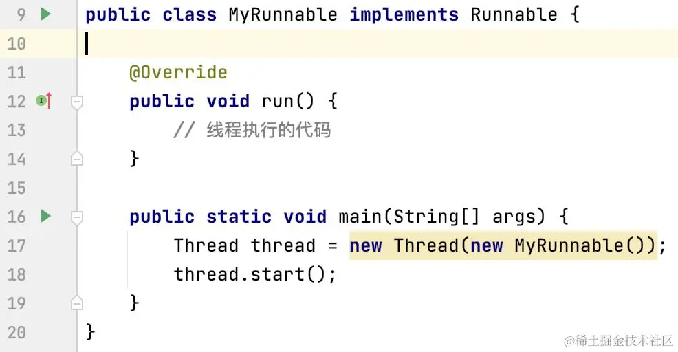尽管这种方式简单直观,但是却破坏了面向对象编程的原则,因为Java不支持多继承。如果你的类已经继承了其他类,就没法再继承 Thread 类了。
