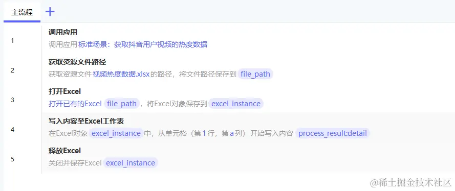 PC端操作:使用[调用应用】指令调用移动端应用获取热度数据 -> 打开Excel -> 使用[写入内容至Excel工作表]指令写入获取的数据 -> 关闭Excel