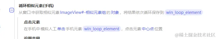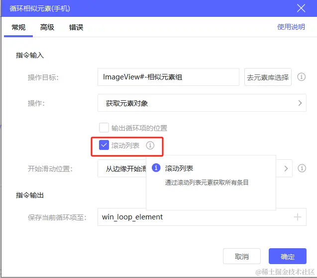 3. 循环点击作品里的视频,进入视频详情,这里需要注意,视频内容较多时,一屏展示不下,数据需要上滑列表才能看到做操作,所以需要把[循环相似元素]指令中的“滚动列表”勾选上,这样就能够自动滚动列表展示